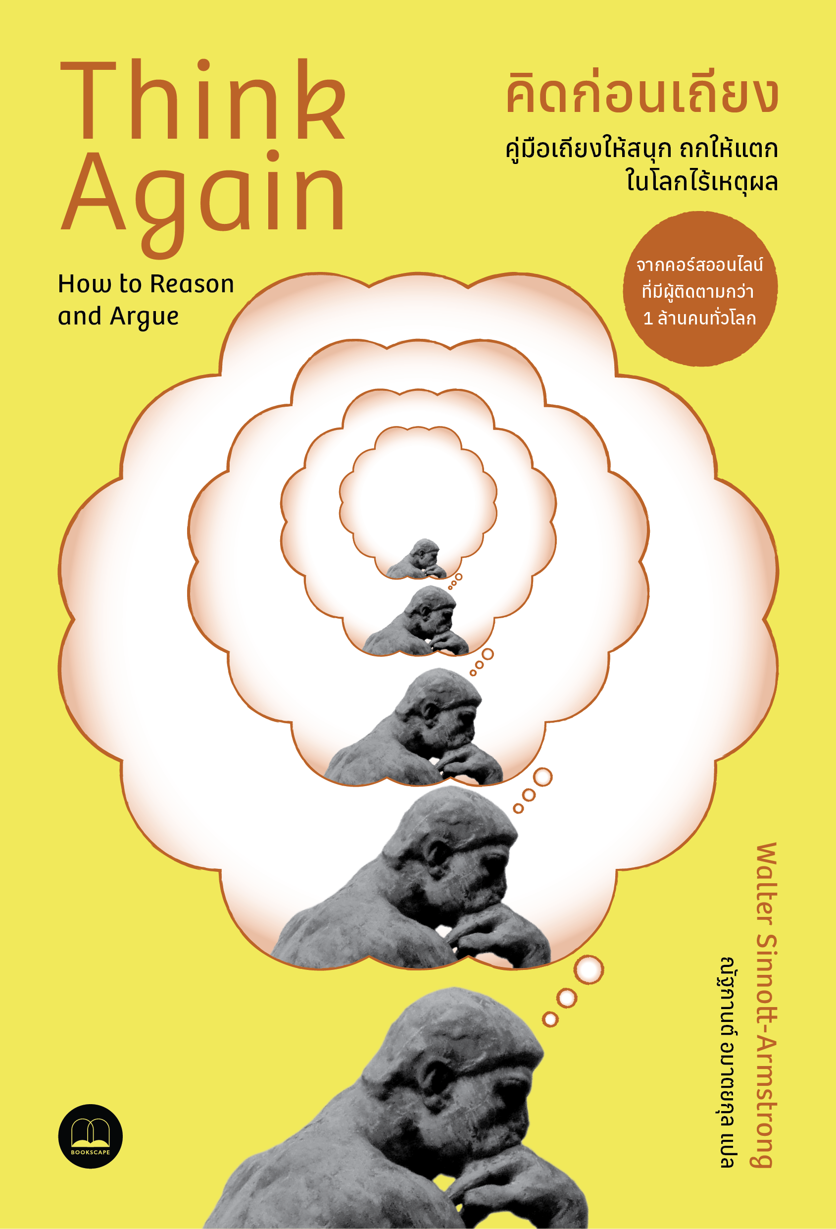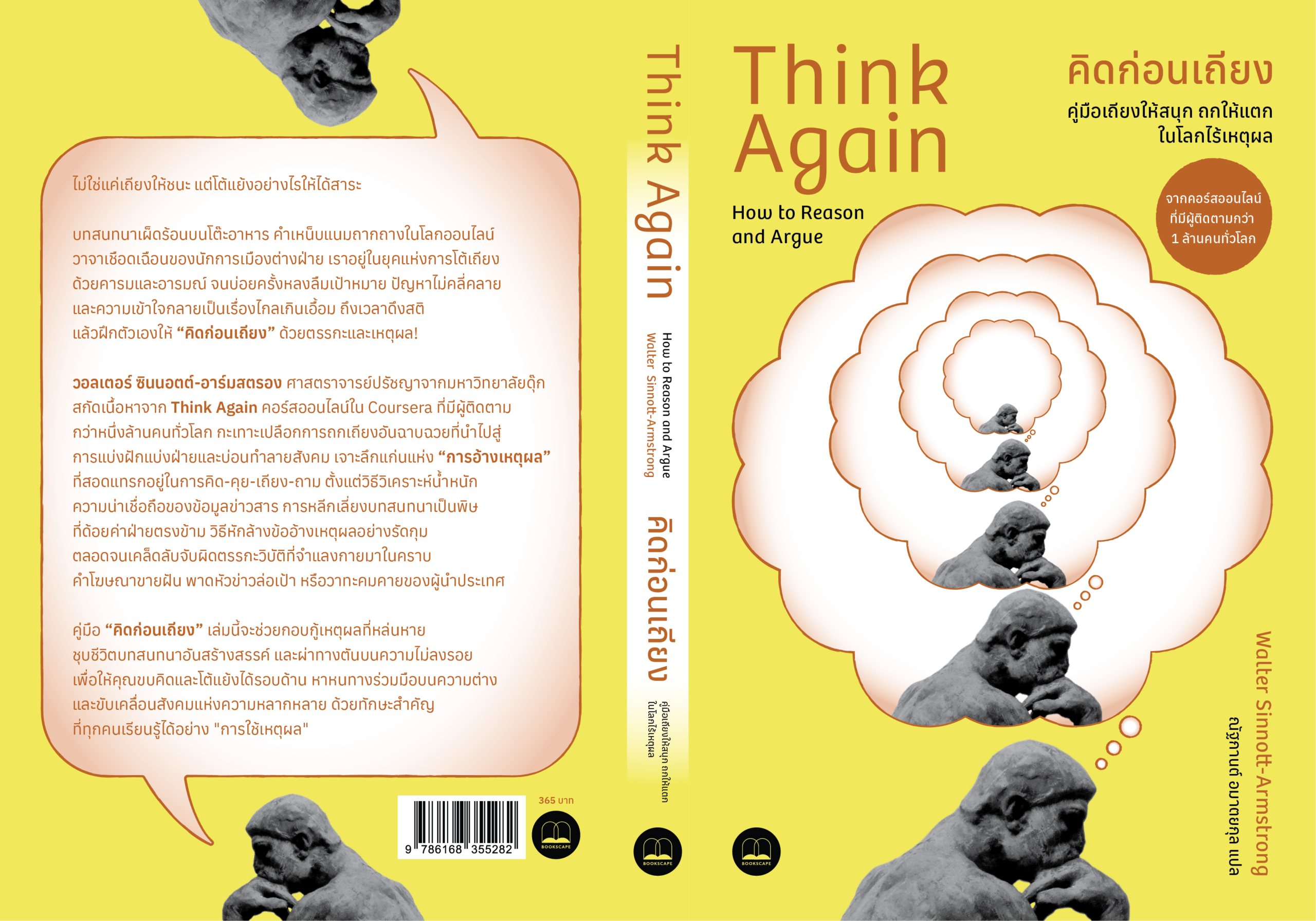 วอลเตอร์ ซินนอตต์-อาร์มสตรอง ศาสตราจารย์ปรัชญาจากมหาวิทยาลัยดุ๊ก สกัดเนื้อหาจาก Think Again คอร์สออนไลน์ใน Coursera ที่มีผู้ติดตามกว่าหนึ่งล้านคนทั่วโลก กะเทาะเปลือกการถกเถียงอันฉาบฉวยที่นำไปสู่การแบ่งฝักแบ่งฝ่ายและบ่อนทำลายสังคม เจาะลึกแก่นแห่ง “การอ้างเหตุผล” ที่สอดแทรกอยู่ในการคิด-คุย-เถียง-ถาม ตั้งแต่วิธีวิเคราะห์น้ำหนักความน่าเชื่อถือของข้อมูลข่าวสาร การหลีกเลี่ยงบทสนทนาเป็นพิษที่ด้อยค่าฝ่ายตรงข้าม วิธีหักล้างข้ออ้างเหตุผลอย่างรัดกุม ตลอดจนเคล็ดลับจับผิดตรรกะวิบัติที่จำแลงกายมาในคราบคำโฆษณาขายฝัน พาดหัวข่าวล่อเป้า หรือวาทะคมคายของผู้นำประเทศ