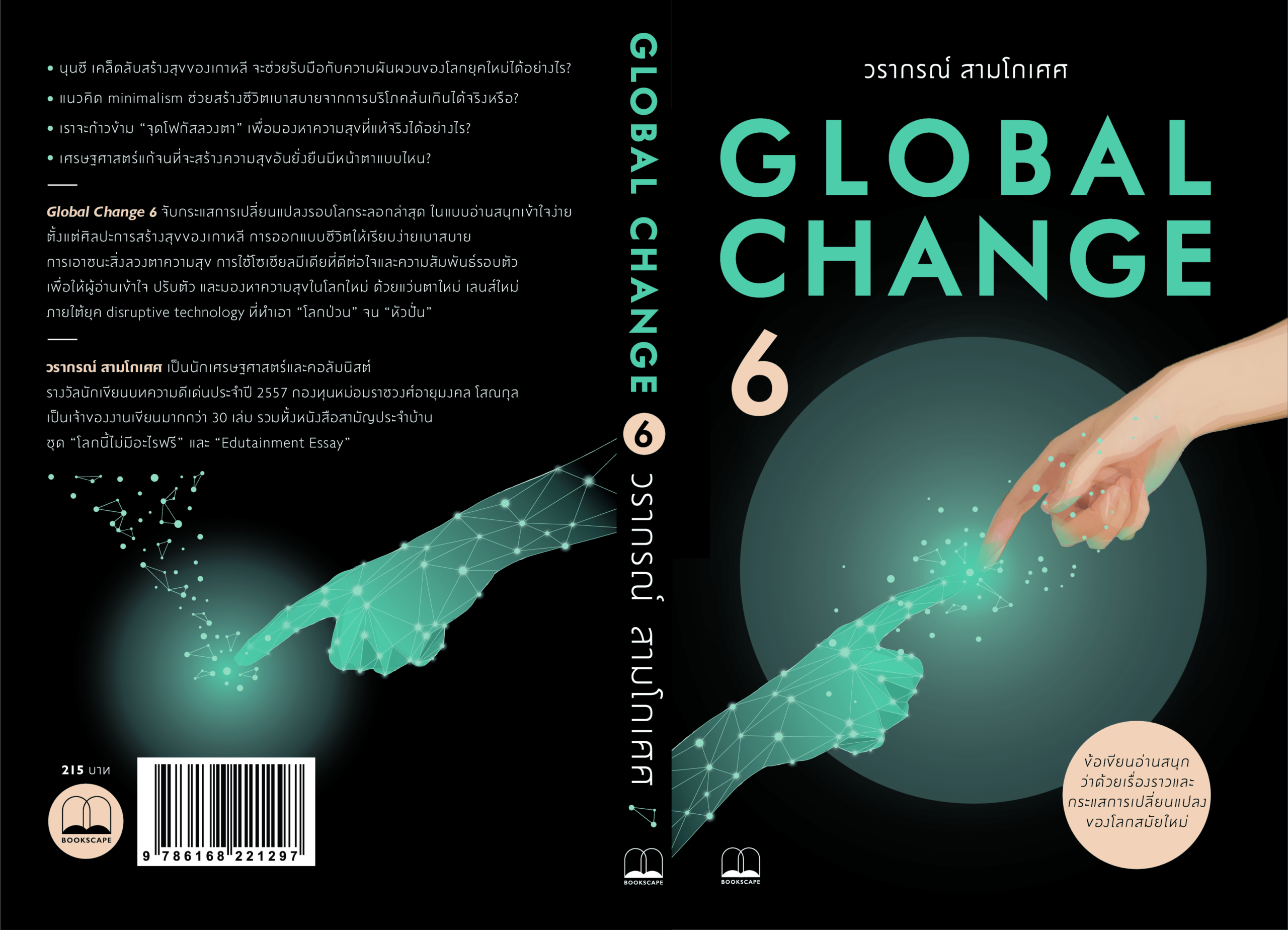 หนังสือ Global Change 6 จับกระแสการเปลี่ยนแปลงรอบโลกระลอกล่าสุด ในแบบอ่านสนุกเข้าใจง่าย ตั้งแต่ศิลปะการสร้างสุขของเกาหลี การออกแบบชีวิตให้เรียบง่ายเบาสบาย การเอาชนะสิ่งลวงตาความสุข การใช้โซเชียลมีเดียที่ดีต่อใจและความสัมพันธ์รอบตัว เพื่อให้ผู้อ่านเข้าใจ ปรับตัว และมองหาความสุขในโลกใหม่ ด้วยแว่นตาใหม่ เลนส์ใหม่ ภายใต้ยุค disruptive technology ที่ทำเอา “โลกป่วน” จน “หัวปั่น”