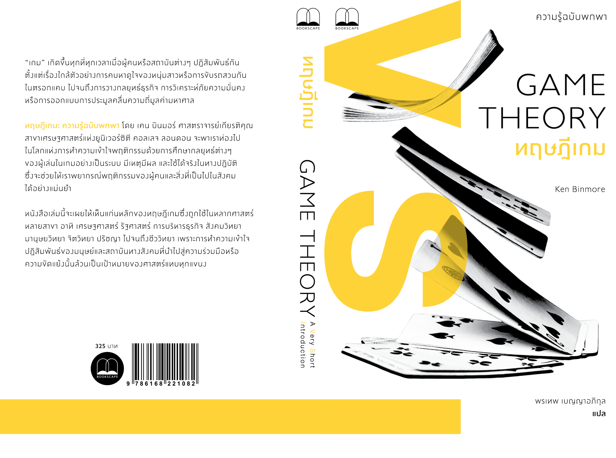 ทฤษฎีเกม: ความรู้ฉบับพกพา โดย เคน บินมอร์ ศาสตราจารย์เกียรติคุณสาขาเศรษฐศาสตร์แห่งยูนิเวอร์ซิตี คอลเลจ ลอนดอน จะพาเราท่องไปในโลกแห่งการทำความเข้าใจพฤติกรรมด้วยการศึกษากลยุทธ์ต่างๆ ของผู้เล่นในเกมอย่างเป็นระบบ มีเหตุมีผล และใช้ได้จริงในทางปฏิบัติ ซึ่งจะช่วยให้เราพยากรณ์พฤติกรรมของผู้คนและสิ่งที่เป็นไปในสังคมได้อย่างแม่นยำ
