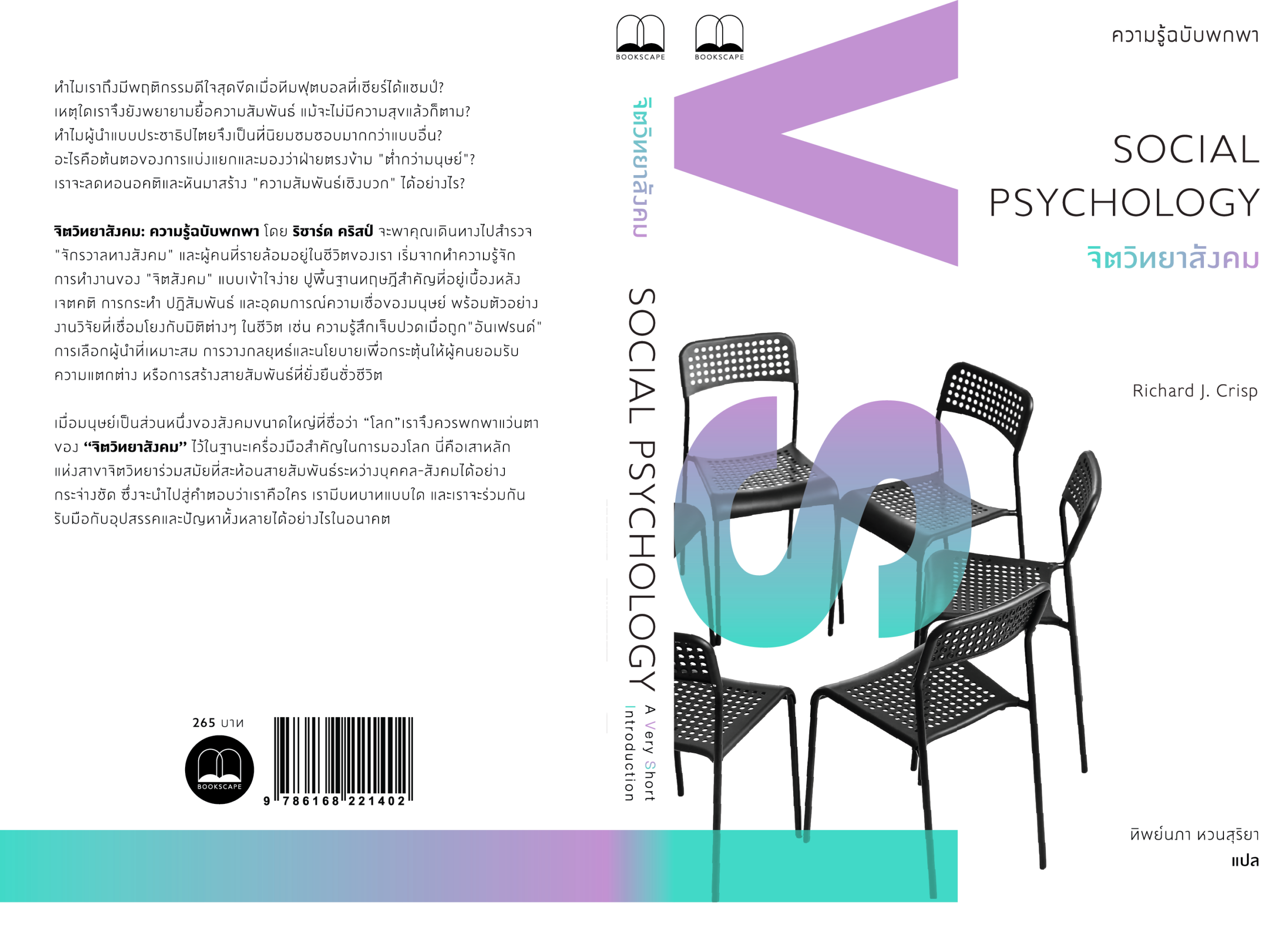 จิตวิทยาสังคม: ความรู้ฉบับพกพา โดย ริชาร์ด คริสป์ จะพาคุณเดินทางไปสำรวจ “จักรวาลทางสังคม” และผู้คนที่รายล้อมอยู่ในชีวิ ตของเรา เริ่มจากทำความรู้จั กการทำงานของ “จิตสังคม” แบบเข้าใจง่าย ปูพื้นฐานทฤษฎีสำคัญที่อยู่เบื้ องหลังเจตคติ การกระทำ ปฏิสัมพันธ์ และอุดมการณ์ความเชื่อของมนุษย์ พร้อมตัวอย่างงานวิจัยที่เชื่ อมโยงกับมิติต่างๆ ในชีวิต เช่น ความรู้สึกเจ็บปวดเมื่อถูก “อันเฟรนด์” การเลือกผู้นำที่เหมาะสม การวางกลยุทธ์และนโยบายเพื่ อกระตุ้นให้ผู้คนยอมรั บความแตกต่าง หรือการสร้างสายสัมพันธ์ที่ยั่ งยืนชั่วชีวิต