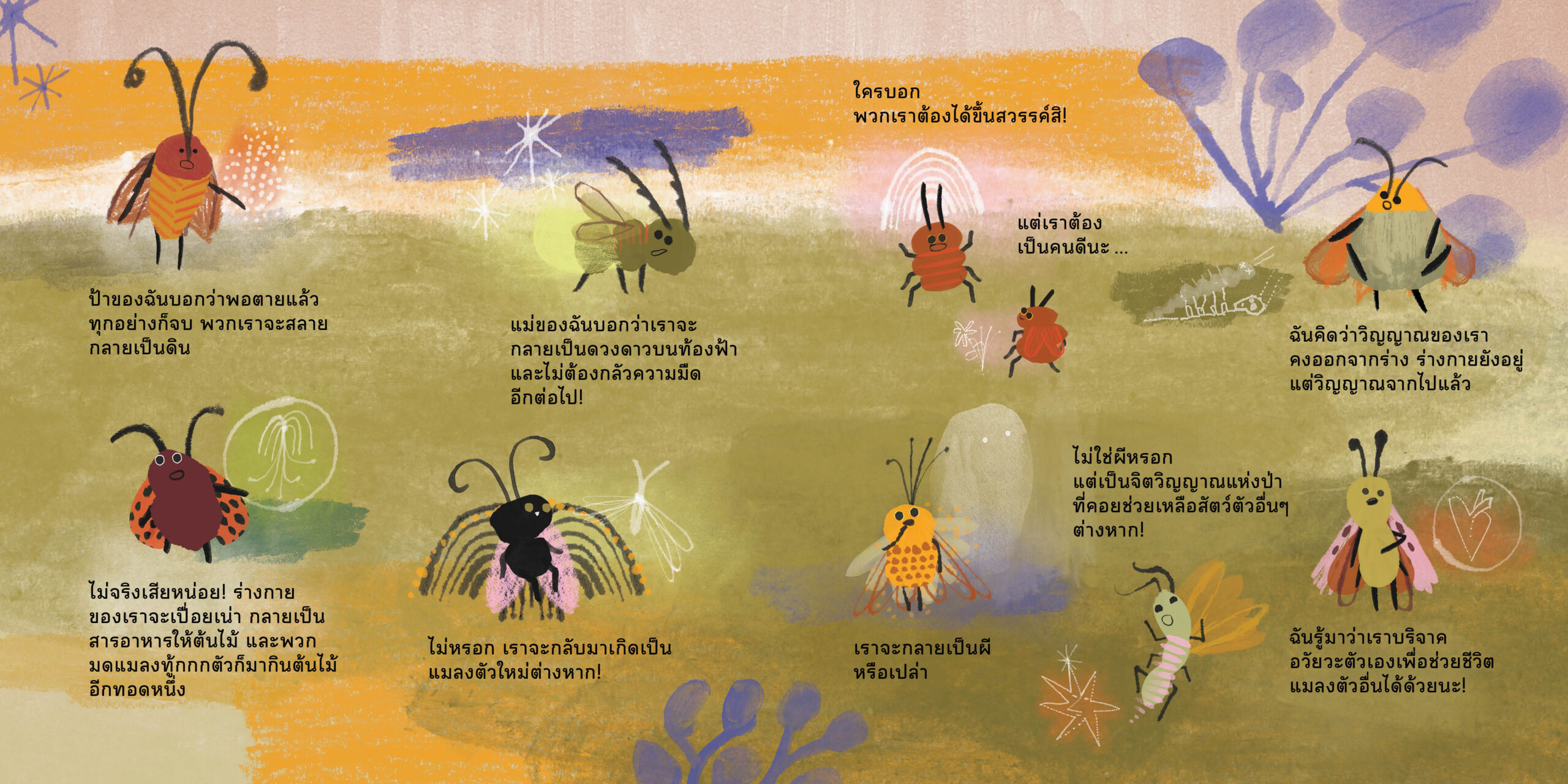 - ชวนเด็กๆ ทำความเข้าใจเรื่องความตายและการสูญเสีย ผ่านเรื่องราวอ่อนโยนของเจ้าหนอนผีเสื้อและเพื่อนมดแมลง สอนให้เข้าใจว่าความตายเป็นกระบวนการหนึ่งของชีวิตที่ผ่านมาและผ่านไป