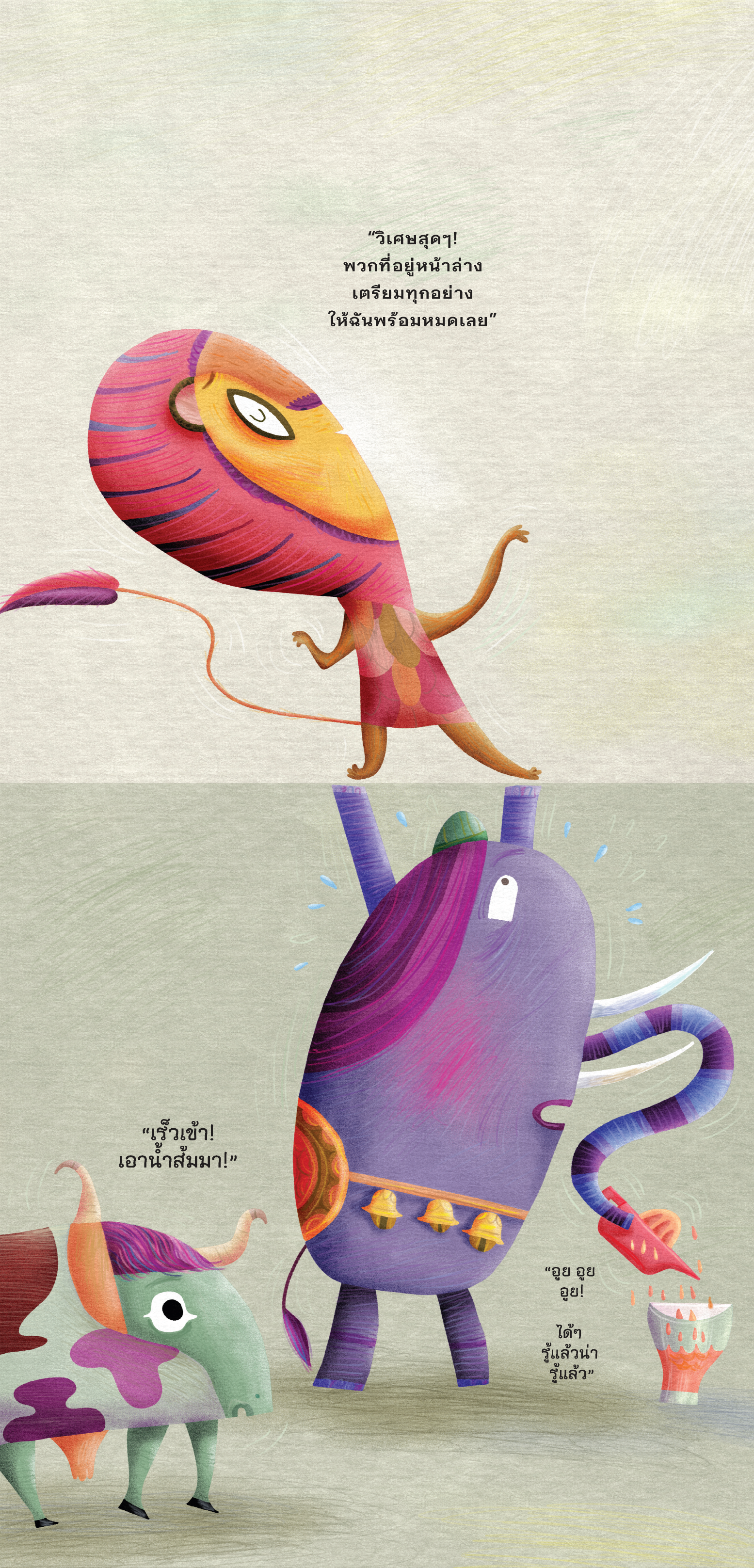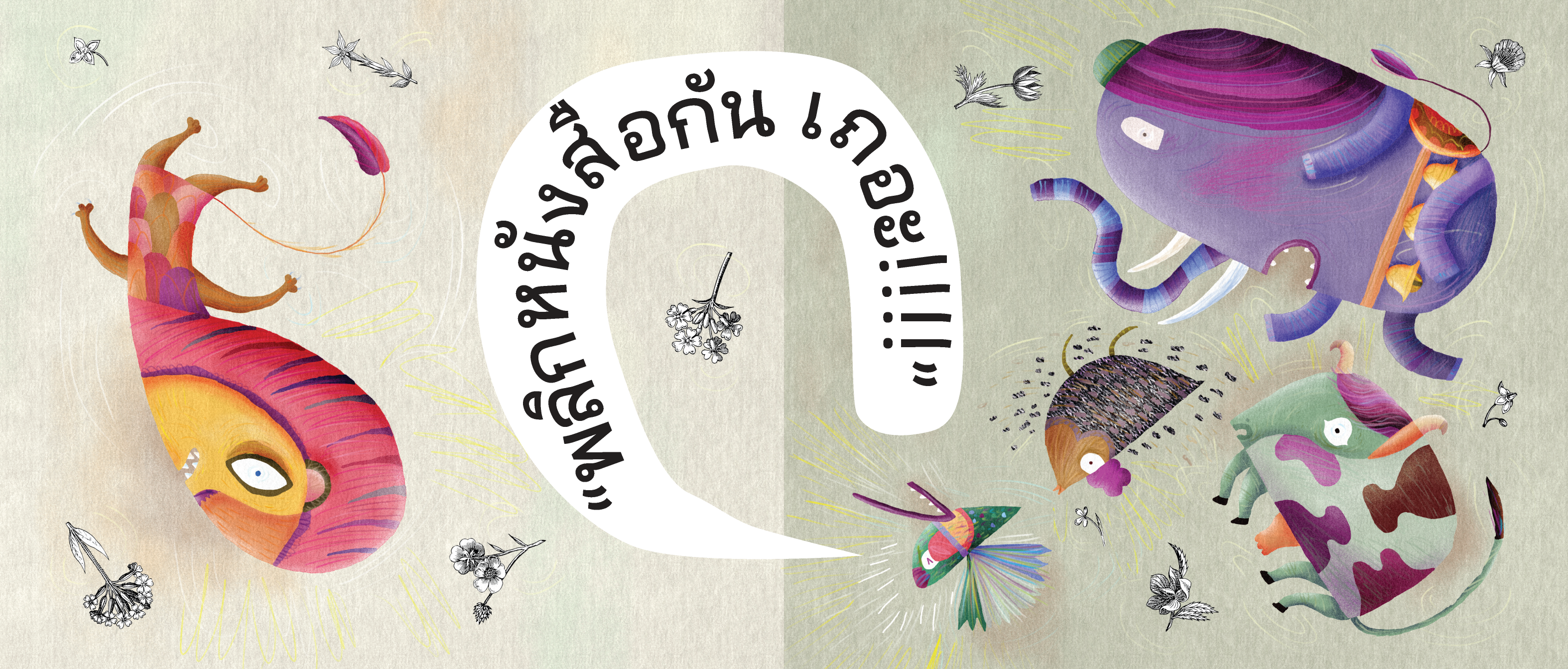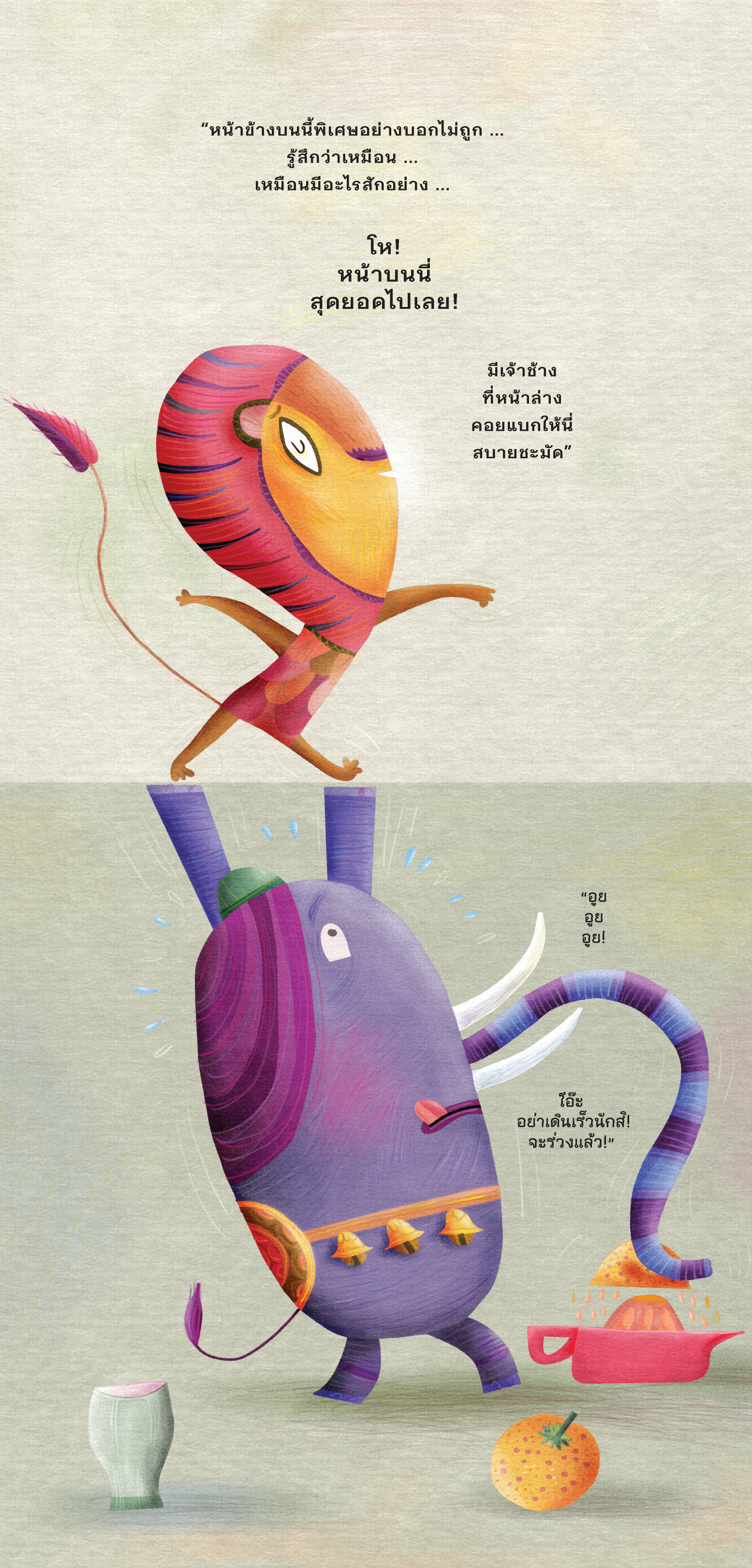 - สอดแทรกรายละเอียดเล็กๆ น้อยๆ ให้สังเกตในเล่ม เช่น รูปแบบตัวหนังสือที่แตกต่างระหว่างหน้าบนหน้าล่าง ให้เด็กๆ ได้ฝึกสังเกตและคิดตาม